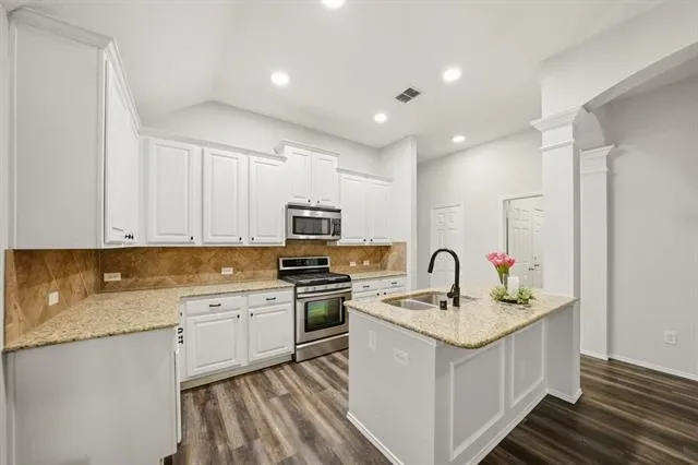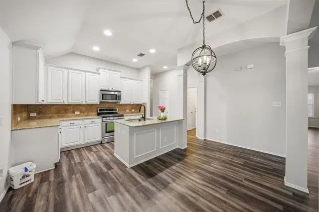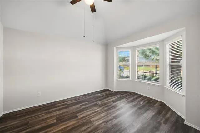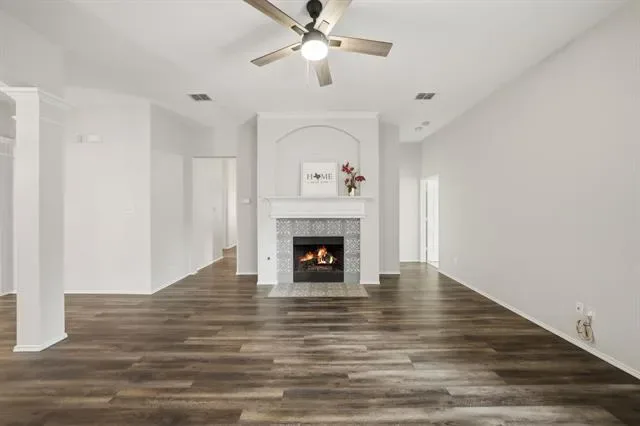 Charming and beautifully updated, this 3 bedroom, 2 bath, office, and bonus flex room with custom barn sliding door home offers approximately 1,962 square feet of thoughtfully designed living space. Fresh updates throughout include fresh new paint, new carpet in primary suite and closet, and stylishly updated light fixtures and ceiling fans, creating a warm and inviting atmosphere from the moment you step inside. Kitchen boasts granite countertops, gas range, designer lighting, wainscoted island, and flows generously to the living area showcasing a cozy gas fireplace with eye catching stenciled tile and white crisp mantle. The spacious primary suite offers a private retreat with bay windows, a sitting area, and serene ambiance. Step into your ensuite bath, relax and soak away the busy day in your garden tub or just take your shower to refresh. You will enjoy many hours relaxing on your back covered patio. Nestled in a charming neighborhood, this home combines style, comfort, and functionality. As a unique bonus, this property may even be recognized from its appearance in an upcoming season of Lioness adding a special touch of distinction. Don’t miss this rare opportunity to own a home in the perfect location conveniently located to major highways, dining, shopping, top notch Northwest ISD, DFW airport and the quaint historical town of Roanoke, Texas.