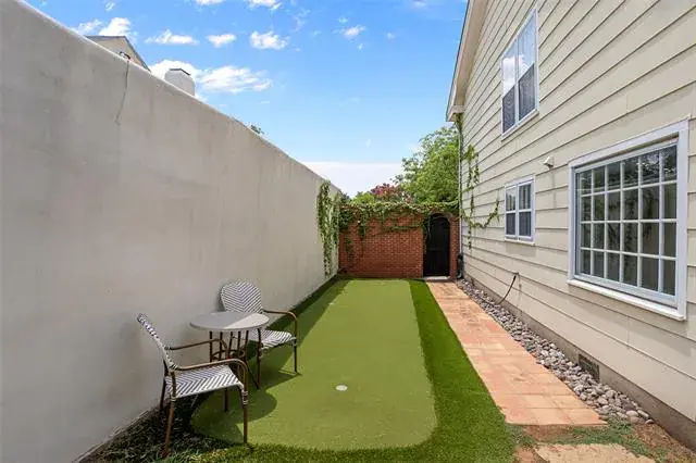 Upstairs, three generously sized bedrooms include a serene primary suite with a sitting area and an en-suite bath. The backyard feels like a private retreat, complete with a side-yard putting green ideal for effortless entertaining. A detached oversized garage provides additional storage and a dedicated office space, adding both practicality and charm.