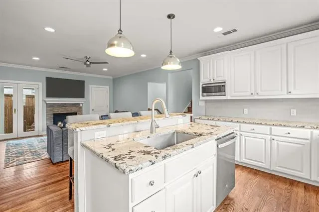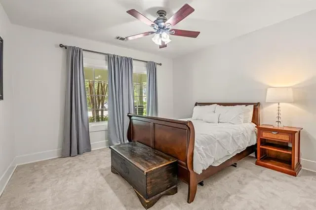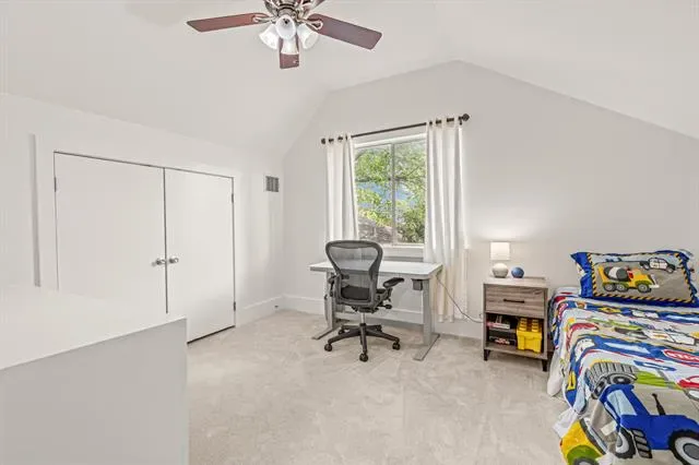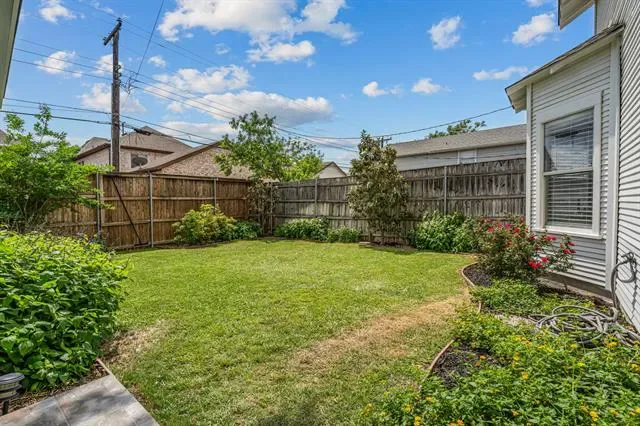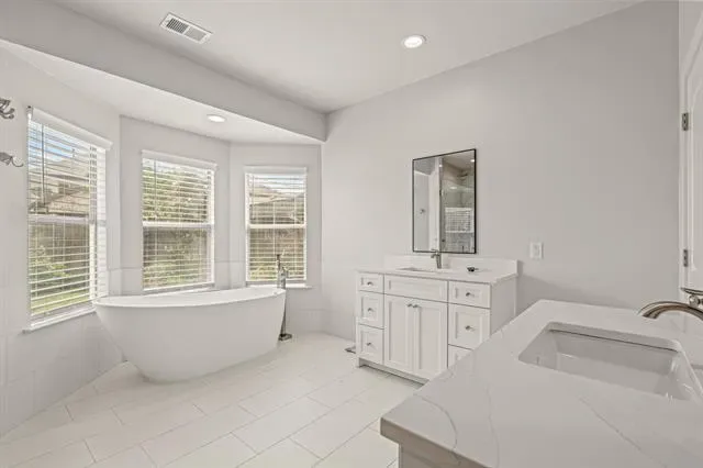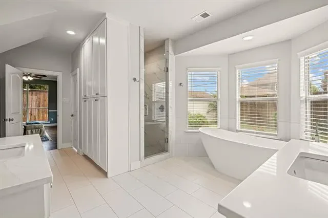 The primary suite is spacious and opens directly to the landscaped backyard. The updated primary bath includes dual vanities, a large walk-in shower, soaking tub, dual closets, and additional storage. Natural light carries through the space, giving it a warm, comfortable feel.