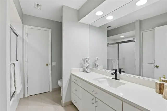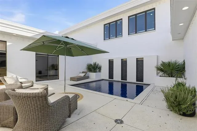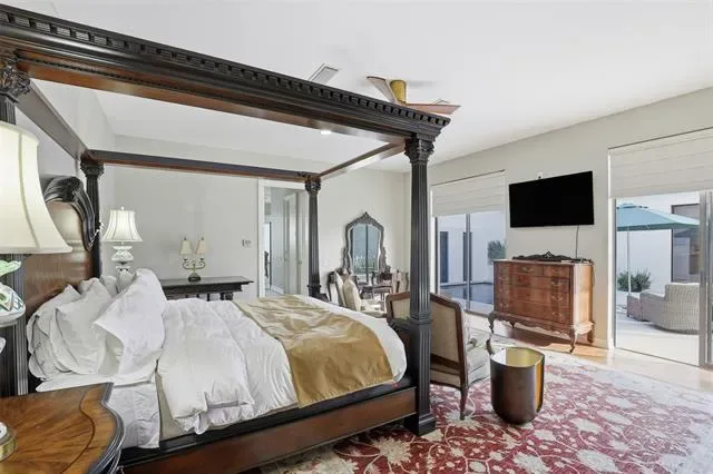 The downstairs primary suite serves as a luxurious retreat, complete with wood flooring, abundant natural light, and two large closets offering exceptional storage. The spa-inspired primary bathroom opens directly onto the private pool deck, creating a serene and seamless connection to the outdoors.
