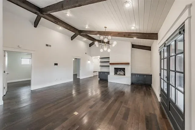 The dramatic main living space features soaring vaulted ceilings with exposed beams, white plank ceilings, and a statement fireplace, creating a warm and inviting setting filled with natural light. The oversized living area flows seamlessly into the kitchen and dining spaces, making the home ideal for both entertaining and everyday living.