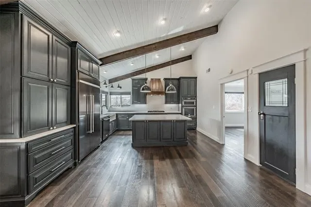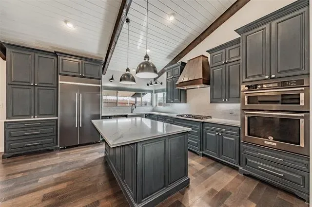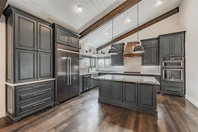 The kitchen serves as the centerpiece of the home and features quartz countertops, custom cabinetry, a large island, and a custom copper vent hood. The KitchenAid appliance package includes a built-in commercial-style side-by-side refrigerator, gas cooktop, and microwave-oven combination.