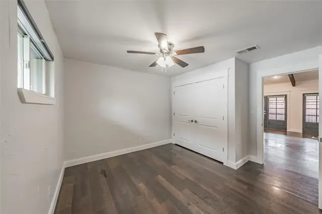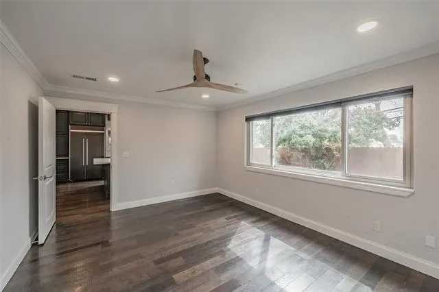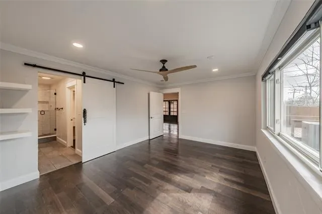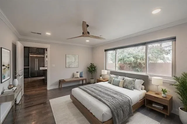The spacious primary suite offers a relaxing retreat with a beautifully updated bath featuring dual vanities, designer fixtures, and a walk-in shower.