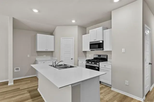 *Seller is willing to assist with closing costs or a rate buy-down through preferred lender with an acceptable offer. * The Justin is a single story, approx. 1,875 sq. ft, home offering 4 bedrooms and 2 baths. This home features a long entryway leading into the open-concept kitchen, dining, and living space. The kitchen overlooks the living room and features granite countertops, stainless steel appliances with gas cooking range, a large kitchen island, and a corner walk-in pantry. With the three secondary bedrooms at the front of the home, the main bedroom is located at the back of the home, just off the living room. The private main bedroom features an ensuite bathroom complete with a huge walk in closet and large walk-in shower with ceramic tile surround. The Justin comes with a covered rear patio giving view to the professionally irrigated and landscaped yard. Additional features include tankless water heater; Ceramic tile flooring at Entry, Kitchen, Living Room, Utility and Bathrooms; and full yard sod, landscaping and irrigation. The Justin includes our HOME IS CONNECTED base package. Using one central hub that talks to all the devices in your home, you can control the lights, thermostat and locks, all from your cellular device.