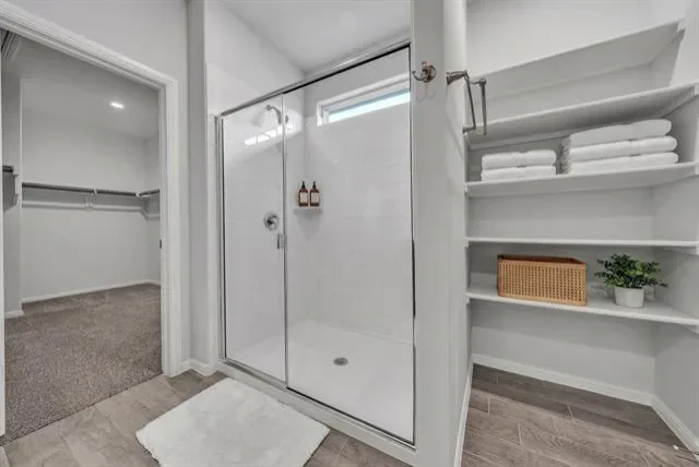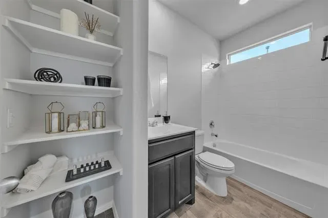 Oversized Primary Suite features walk-in shower, dual-sink vanity, massive walk-in closet &' built-in linen shelves. Large backyard with rear brick privacy wall. Upgraded with tankless water heater, automated electric blinds, sprinkler system &' gutters.