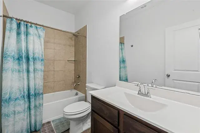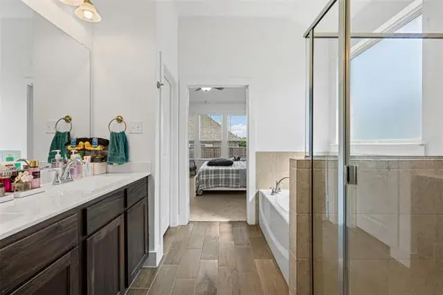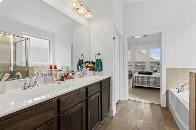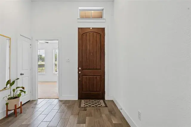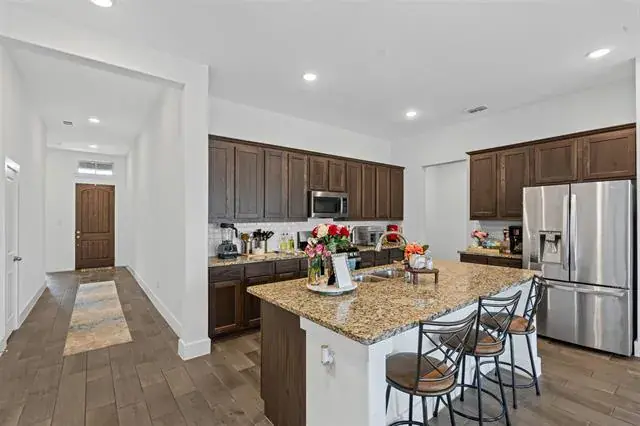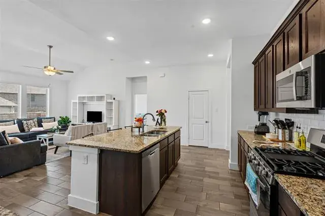 This isn’t your builder-basic box. From the moment you walk in, you’ll notice details that make daily life easier and entertaining more fun, wood-look tile flowing through the main spaces, tall ceilings, and a kitchen that actually feels like the center of the home. The oversized granite island is made for gatherings, while stainless appliances, custom cabinetry, and a sharp backsplash pull the look together. The private primary suite feels like a retreat with its soaking tub, walk-in shower, dual sinks, and big closet. Two more bedrooms sit separately for privacy and flexibility. Smart features like app-controlled lights, thermostat, oven, and a Ring doorbell keep things simple. Out back, a covered patio and sprinkler-fed yard mean low-maintenance weekends. Out front, you’re across from the greenbelt and just steps to the pool, playground, and trails. Add in quick access to Chisholm Trail Parkway, and you’re downtown in minutes.