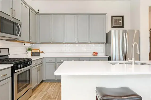 Quartz countertops, beautifully finished cabinetry, a spacious island, stainless steel appliances, and gas cooking create a space made for everyday living and effortless entertaining. The kitchen flows seamlessly into the family room, where sunlight pours in, and gatherings feel easy and natural.