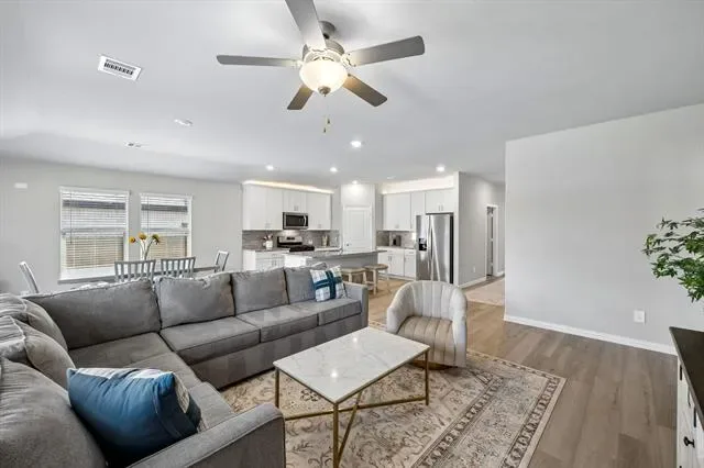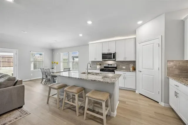 Welcome to this stunning, like-new 2024 built single story home in the sought after Cibolo Hills community of Fort Worth. Thoughtfully designed for modern living, this home offers 4 spacious bedrooms and 3 full bathrooms, including a private guest suite with its own ensuite bath, ideal for visitors or multigenerational living. The open concept layout is filled with natural light and complemented by soaring ceilings. The heart of the home features a bright and inviting living area, seamlessly connecting to a spacious dining area and a beautifully appointed kitchen. The chef-inspired kitchen showcases quartz countertops, subway tile backsplash, gas cooktop, electric oven, dishwasher, and a large center island perfect for gathering and entertaining. Luxury wide-plank flooring flows throughout the main living spaces, adding both style and durability. Step outside to a beautifully backyard with a covered patio, ideal for relaxing evenings or weekend gatherings. Meticulously maintained and truly move-in ready, this home offers both comfort and convenience, with easy access to Highway 287 and a short drive to downtown Fort Worth and surrounding areas.