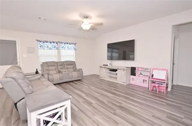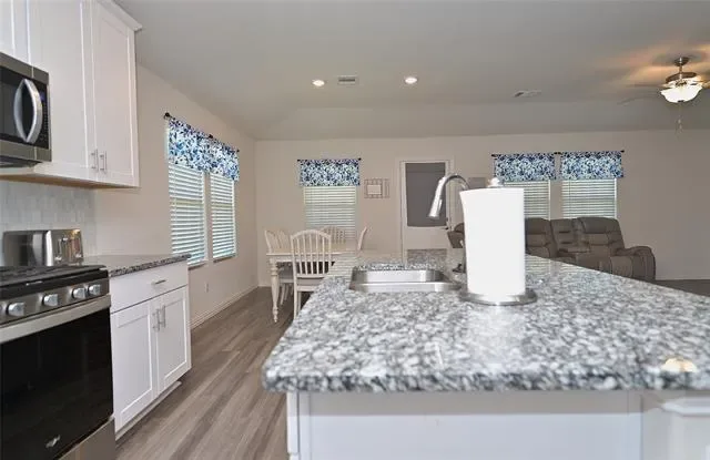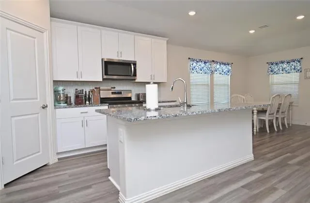 BEAUTIFUL, 4 BEDROOM, 3 FULL BATH HOME on a premium corner lot in the Community of Cibolo Hill in Fort Worth, Texas, where residents enjoy a resort style pool, parks, walking-jogging-bike trails and well maintained common areas!! Zoned for Eagle Mountain-Saginaw ISD with two on-site schools, the New Eagle Mountain-Saginaw High, and an additional campus planned for the future. Built in 2021 with 2,059 sq ft of living space and an expansive open concept living area, perfect for entertaining, family and friends. The modern kitchen is a Chef’s dream, featuring an abundance of cabinet and counter space, granite countertops, large seating Island, stainless steel appliances with 5 burner gas stove, tiled backsplash and walk-in pantry. Wood look Luxury vinyl flooring flows seamlessly throughout the hall, dining and main living areas. The split bedroom design enhances privacy, with the primary suite located at the rear of the home, offering an over sized shower, wide two sink vanity and huge walk-in closet. The front 4th Bedroom is a great optional Office or guest Bedroom. The deep 13 ft tiled laundry room offers additional space for a Freezer or folding table. Brick & stone front elevation with a nicely landscaped yard. Large privacy fenced backyard, covered back patio, sprinkler system, gutters and more in this well established community! Short commute to the Alliance Town Center, Eagle Mountain Lake, Fossil Creek Golf Club and major highways with key employers in the Alliance corridor. Schedule a tour to see this lovely home today!