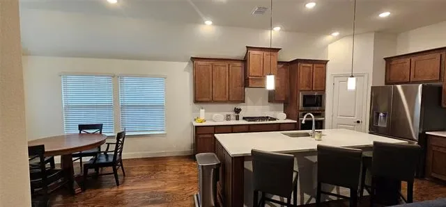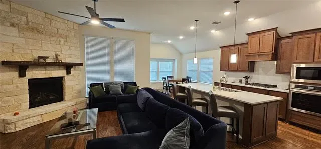 Elevated living meets everyday comfort in this beautifully designed 4-bedroom home, perfectly positioned in one of Fort Worth’s most sought-after communities. From the moment you step inside, you’re greeted by soaring ceilings, an open-concept design, and rich vinyl plank flooring that brings both warmth and durability to the space. Designed for gathering and entertaining, the kitchen features striking dark cabinetry, a generous island, and a gas range—flowing seamlessly into the expansive living area anchored by a cozy stone gas fireplace. The layout feels both open and intentional, offering the ideal balance of connection and comfort. Step outside and you’ll immediately notice what sets this home apart—an oversized backyard, paired with a sleek epoxy-coated patio perfect for outdoor entertaining or quiet evenings under the Texas sky. The epoxy-finished garage adds a polished, high-end touch, bringing modern convenience to your daily routine. Every detail has been thoughtfully considered to offer a move-in ready experience that stands above the rest. If you’ve been searching for a home that combines elevated finishes, functional design, and a standout lot—this is the one that delivers. Experience the difference for yourself.