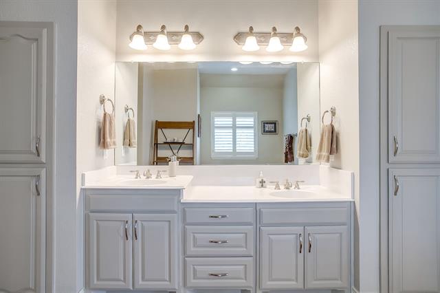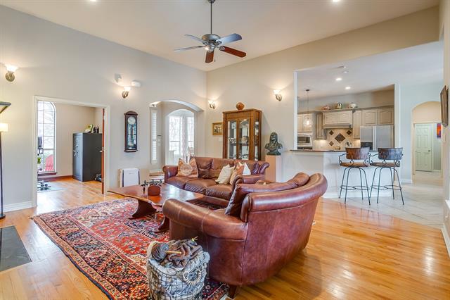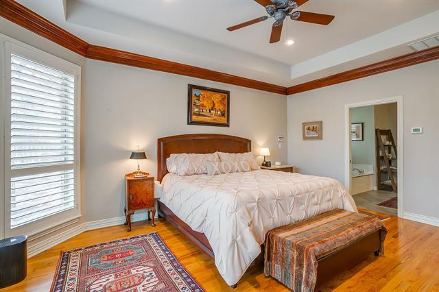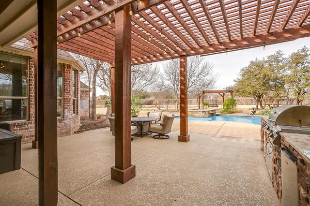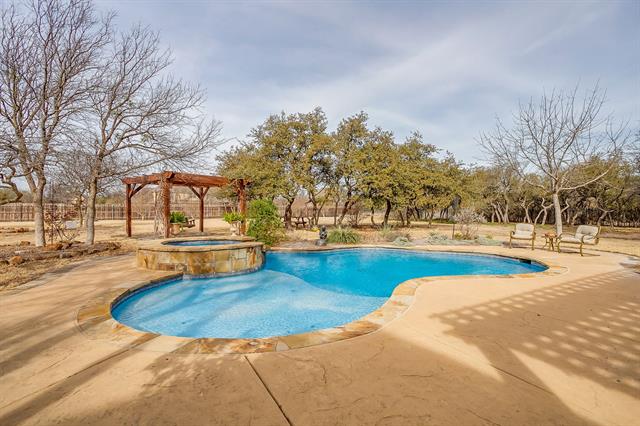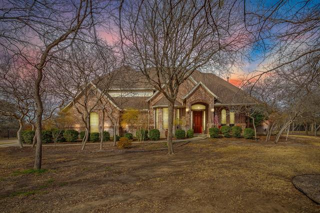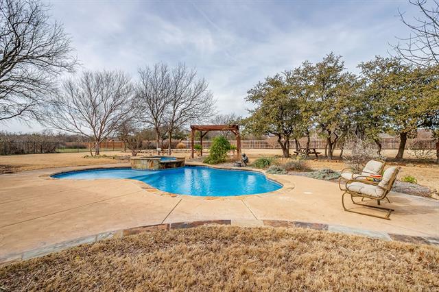 Situated on just over an acre in Covered Bridge Canyon this 5 Bedroom, 3 and a half bath custom home exudes timeless style, quality craftsmanship and elevated finishes. Classic brick exterior opens to warm hardwood floors, crown molding and walls of windows throughout – all overlooking the sparkling pool and expansive backyard. Exceptional floorplan features 2 Living spaces, 2 Dining areas, an office, powder bath and THREE bedrooms all on the FIRST FLOOR-ideal for large families, guests or multigenerational living. Enjoy cooking in this stunning kitchen complete with painted cabinets, granite counters, NEW appliances, LARGE walk in pantry and updated lighting! Serene primary retreat with tray ceiling, crown molding, dual vanities, jetted bathtub, walk in closet and lots of windows with plantation shutters-so pretty! The two bedrooms downstairs each have their own vanity and adjoining bath. UPSTAIRS-Two generously sized bedrooms with HUGE WALK IN CLOSETS and hall bathroom. Experience your own private oasis in the backyard! Magnificent pool and spa, outdoor living space with kitchen and pergola so you can entertain all year! Oversize 3 car garage with plenty of room for cars, trucks, toys, deep freezer and refrigerator! ALEDO SCHOOLS! Do not miss the FULLY DECKED ATTIC and Storm Shelter! Meticulously maintained and lots of UPDATES! See TD for MORE!