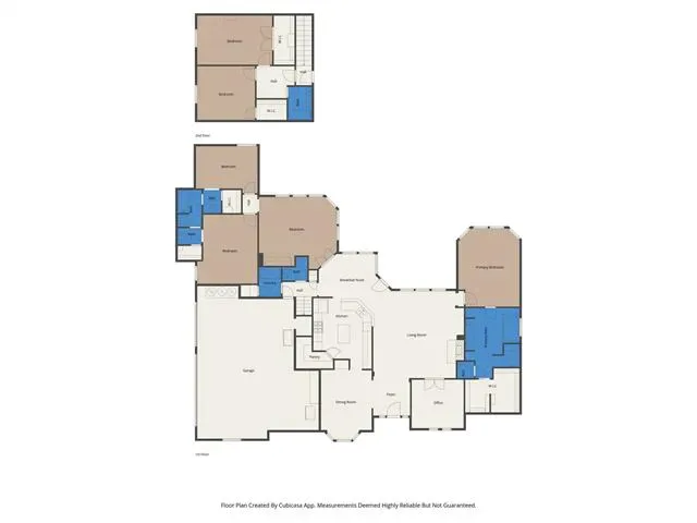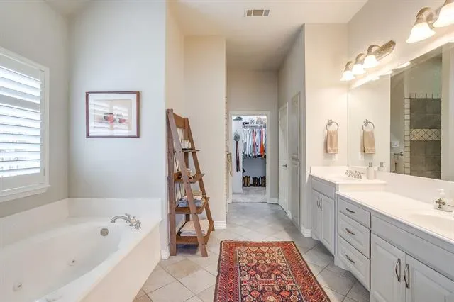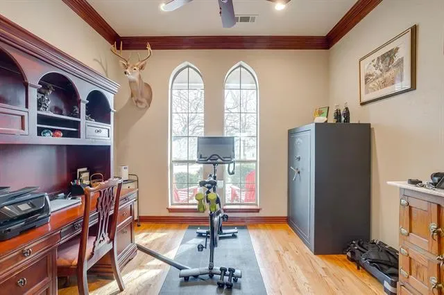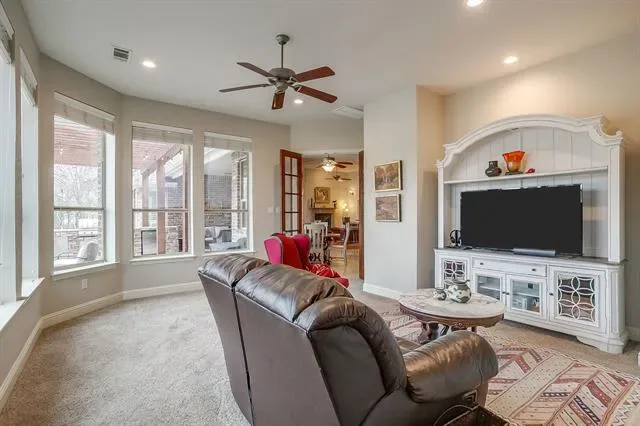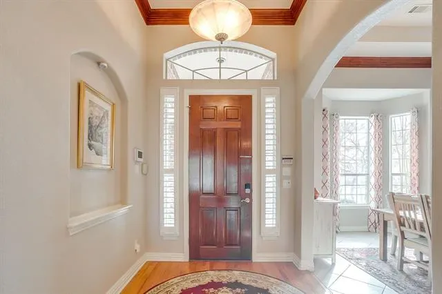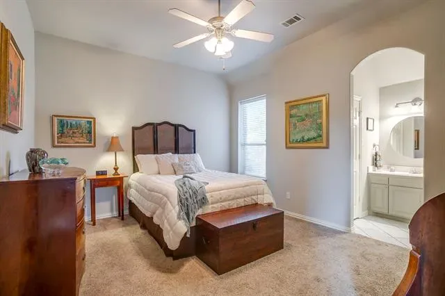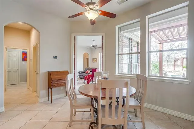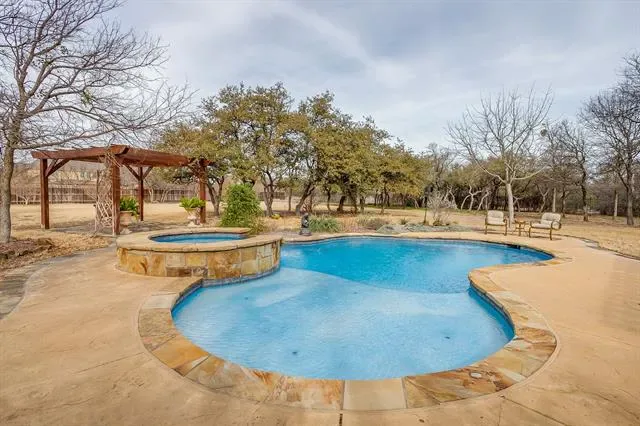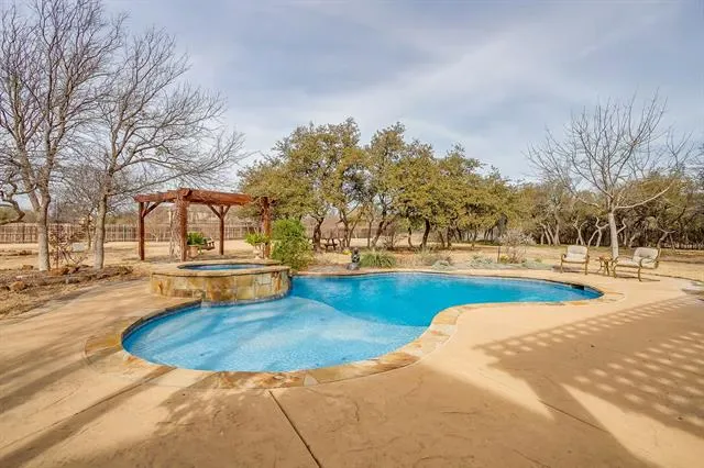 Situated on just over an acre in Covered Bridge Canyon this 5 Bedroom, 3 and a half bath custom home exudes timeless style, quality craftsmanship and elevated finishes. Classic brick exterior opens to warm hardwood floors, crown molding and walls of windows throughout – all overlooking the sparkling pool and expansive backyard. Exceptional floorplan features 2 Living spaces, 2 Dining areas, an office, powder bath and THREE bedrooms all on the FIRST FLOOR-ideal for large families, guests or multigenerational living. Enjoy cooking in this stunning kitchen complete with painted cabinets, granite counters, NEW appliances, LARGE walk in pantry and updated lighting! Serene primary retreat with tray ceiling, crown molding, dual vanities, jetted bathtub, walk in closet and lots of windows with plantation shutters-so pretty! The two bedrooms downstairs each have their own vanity and adjoining bath. UPSTAIRS-Two generously sized bedrooms with HUGE WALK IN CLOSETS and hall bathroom. Experience your own private oasis in the backyard! Magnificent pool and spa, outdoor living space with kitchen and pergola so you can entertain all year! Oversize 3 car garage with plenty of room for cars, trucks, toys, deep freezer and refrigerator! ALEDO SCHOOLS! Do not miss the FULLY DECKED ATTIC and Storm Shelter! Meticulously maintained and lots of UPDATES! See TD for MORE!