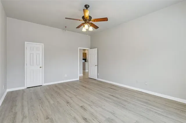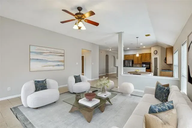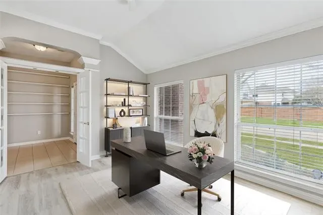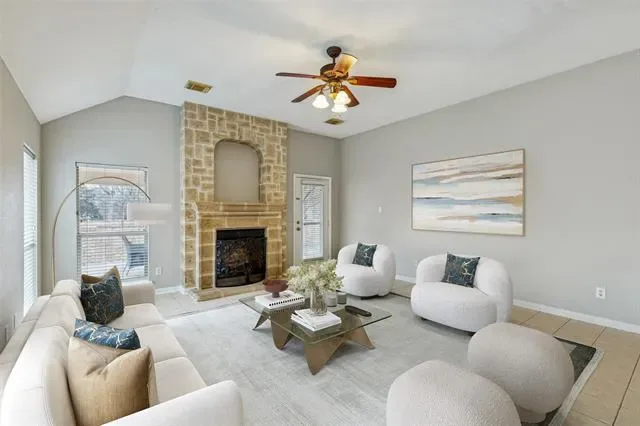Stunning single-story residence showcasing an elegant brick and stone elevation and timeless curb appeal. Step inside to a refined formal living room highlighted by picture-frame wainscoting and classic crown molding. Just off the entry, a private study sits behind French doors and features soaring ceilings and rich hardwood floors, ideal for working from home. The spacious main living area offers easy-care tile flooring, a dramatic floor-to-ceiling stone fireplace, and seamless flow into the inviting breakfast nook. The charming kitchen is both functional and stylish, complete with a wraparound breakfast bar, gas cooktop, and generous cabinetry. The serene primary suite provides ample space for a sitting area, while the en-suite bath features dual vanities, a jetted soaking tub, separate shower, and a walk-in closet. A truly unique floor plan includes a secondary living area with private exterior access, a kitchenette, full bedroom, and bathroom, perfect for multigenerational living, a guest suite, or a private teen retreat. Well-proportioned guest bedrooms complete the interior. Out back, enjoy a covered patio plus an additional open patio with built-in grill, perfect for entertaining. The 2.5 car garage offers versatility, with one bay converted into an exercise room. Residents enjoy exceptional community amenities including lakes, a pool and splash pad, parks, and more.
