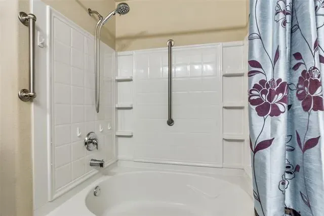 The spacious primary suite fits a full 3 piece bedroom set and more, with a private ensuite bathroom and walk-in linen closet. Two secondary bedrooms share a full bath with tub and shower combo. Both bathrooms include accessibility handrails. Backyard patio with grill space, plus a side storage shed. New roof November 2025.