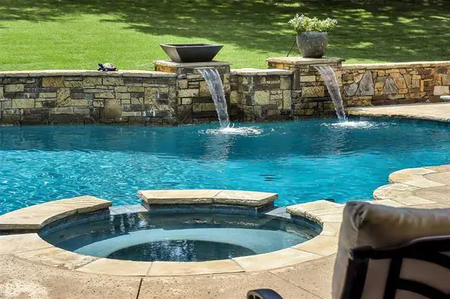 Diving Board, Fenced, Gunite, Heated, In Ground, Outdoor Pool, Pool Sweep, Pool/Spa Combo, Pump, Salt Water, Separate Spa/Hot Tub, Waterfall