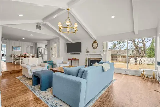 Boasting 6 bedrooms and 5 full bathrooms, the floor plan is both expansive and intentional—offering privacy, flexibility, and effortless flow for elevated living and entertaining. The grand living room stuns with soaring vaulted ceilings, abundant natural light, and a striking fireplace that anchors the space with warmth and style. A second fireplace in the formal dining room creates an intimate setting for unforgettable gatherings.