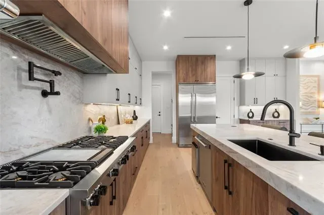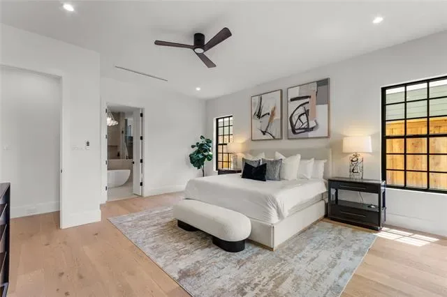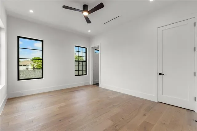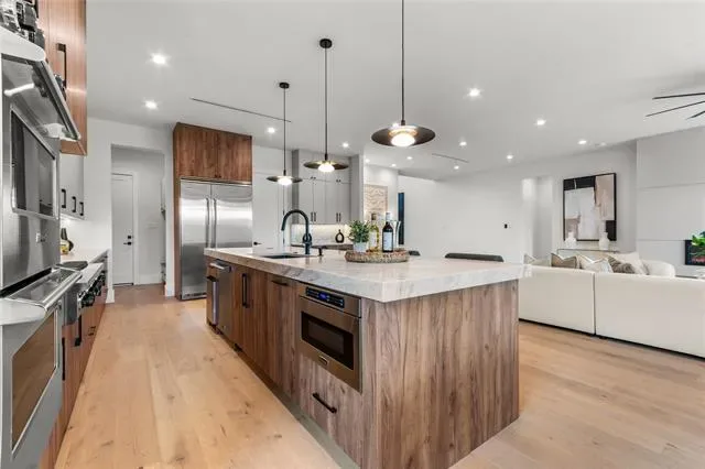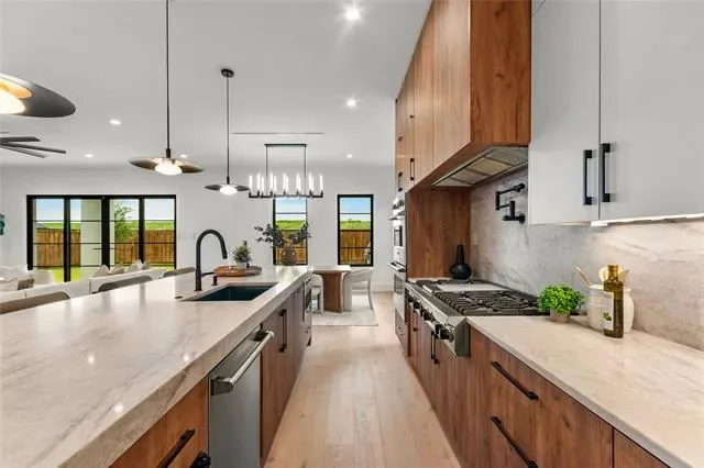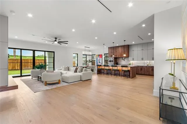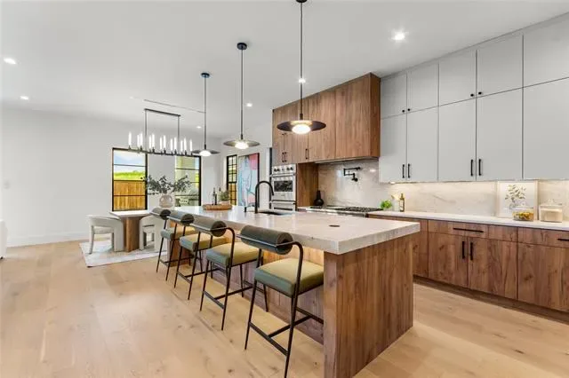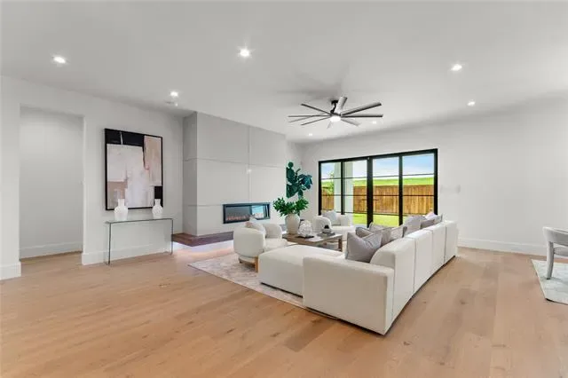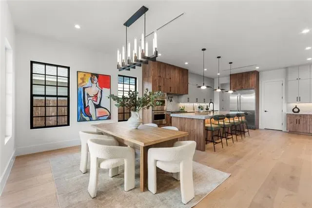 Nestled on Fort Worth’s Westside just feet from the banks of the Trinity River, 741 Edgefield sits in the heart of sought-after Crestwood, a neighborhood prized for its walkability to the Trinity Trails, tree-lined streets, spectacular sunsets, and that tucked-away feeling only the Westside delivers. Minutes from River Crest, the Cultural District, Dickies Arena, The Crescent, Bowie House, and the area’s newest retail and dining, this is location at its most rare. Behind a striking white stucco and charcoal brick facade, Elim Homes delivers a new-construction custom residence that meets the standard of one of Fort Worth’s most established neighborhoods. Five bedrooms, five and a half baths, plus a dedicated office, game room, and home theater unfold across two thoughtfully designed stories. Soaring ceilings, wide-plank engineered white oak floors, and walls of steel-framed windows fill every room with light. The chef’s kitchen anchors the main level with tobacco craft oak cabinetry, a natural stone waterfall island, pot filler, walk-in pantry, and premium appliance package flowing into the living and dining rooms and out to a covered patio with wood-clad ceiling, built for entertaining. The primary suite is a true retreat: floating walnut vanity, soaking tub, oversized wet room, and custom closet. Upstairs: game room, theater, and four en-suite bedrooms. Plus wet bar, wine display, mudroom, laundry, and an EV-ready oversized garage. A rare new build where Crestwood charm meets uncompromising design.