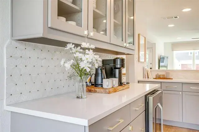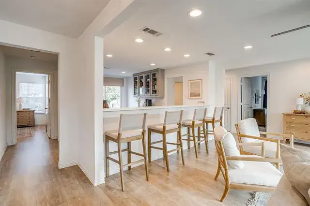 Step inside to a bright, open-concept layout anchored by large picture windows and warm flooring that carries throughout. The spacious living room is filled with natural light and flows seamlessly into the dining area and a stunning, magazine-worthy kitchen. Soft-gray custom cabinetry, brass hardware, glass-front uppers, quartz countertops, stainless appliances, and an oversized breakfast bar with seating create the ideal space for hosting and everyday living. The thoughtful floor plan places the primary suite privately, featuring a large walk-in closet and an updated ensuite bath. Secondary bedrooms are generously sized, versatile, and beautifully finished.