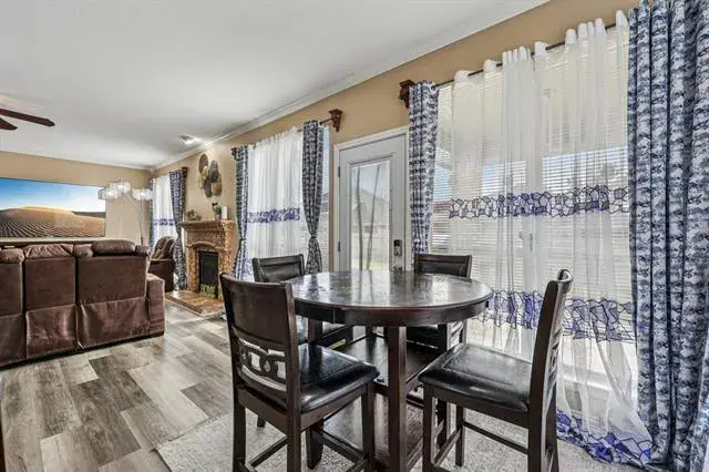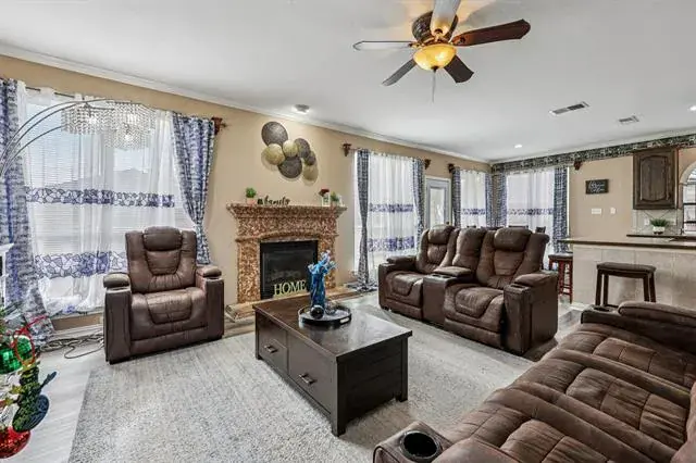 The open-concept layout features a kitchen that flows into the living area, perfect for entertaining. The kitchen includes a gas stove, stainless steel appliances, large pantry, utility room, and two dining areas, including a cozy eat-in space with a peninsula bar.