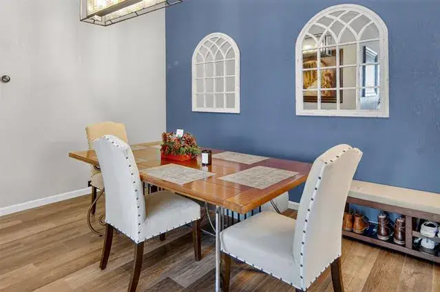 Outside, the landscaped surroundings provide a picturesque backdrop for the property. Whether you’re hosting outdoor gatherings or enjoying a quiet evening, the backyard offers endless possibilities.