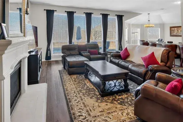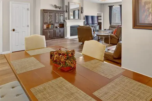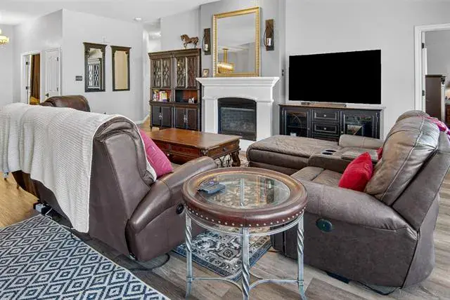 Upon entry, the open concept design welcomes you with its seamless flow between living spaces. The large living room, centered around a cozy gas log fireplace, invites relaxation and gatherings. Adjacent, the formal dining area offers a distinguished space for hosting dinner parties or enjoying family meals.