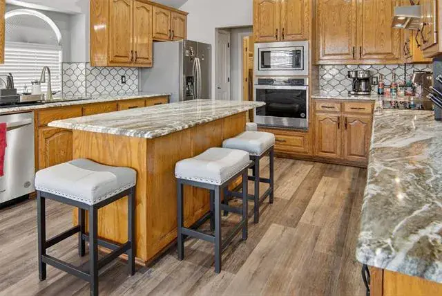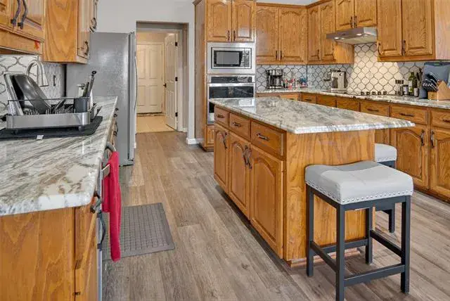 The heart of the home is the expansive kitchen, designed with functionality and elegance in mind. Featuring sleek granite countertops and updated appliances, this kitchen is a culinary enthusiast’s dream. With generous cabinetry and a convenient layout, meal preparation becomes a delight. Newer luxury vinyl plank (LVP) flooring throughout enhances the home’s contemporary appeal while ensuring longevity and ease of care.