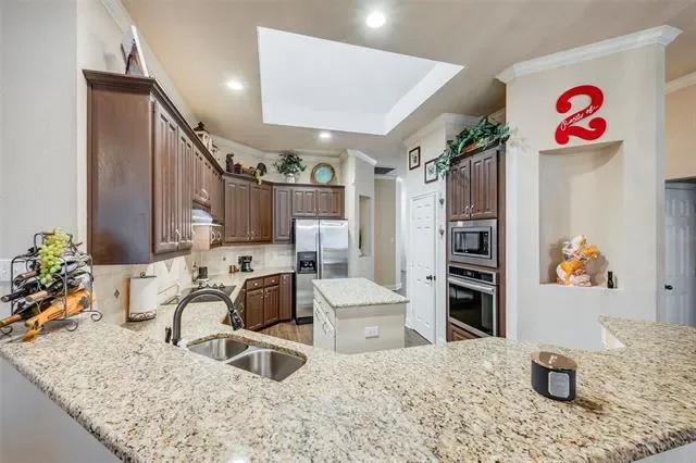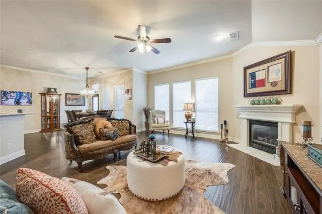 Pristine home with exceptional curb appeal, highlighted by beautiful landscaping and a welcoming front porch. Nestled in a quiet, established neighborhood with convenient access to I-35 and Hwy 820. This well-designed home offers 3 spacious bedrooms, 2 full baths, two primary bedrooms, formal living and dining areas accented with crown and chair rail molding. A generously sized family room featuring a cast stone fireplace with mantle is the heart of the home—perfect for relaxing or entertaining! This fantastic open floorplan suits any lifestyle. The large kitchen boasts an island, granite counters, abundant cabinet space, stainless steel appliances, built in oven, ample bar seating, and a cozy breakfast nook. The private primary suite includes a garden tub, separate shower with seamless shower glass, granite counters, large walk in closet, and a comfortable retreat-like feel. Enjoy outdoor living in the gorgeous backyard with mature trees and a tiled covered patio, ideal for morning coffee or evening gatherings. This home is truly gorgeous and won’t last long at this price!