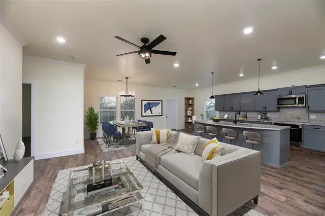 The open-concept floor plan blends function and style with luxury vinyl plank flooring throughout—no carpet—for a clean, modern look and easy maintenance. The kitchen is the heart of the home, featuring an eat-in dining area, oversized island with seating, granite countertops, tile backsplash, under-cabinet lighting, and a spacious pantry—perfect for everything from quick breakfasts to holiday hosting. Granite countertops continue into both bathrooms for a cohesive, elevated finish.