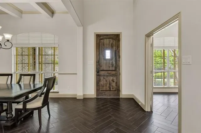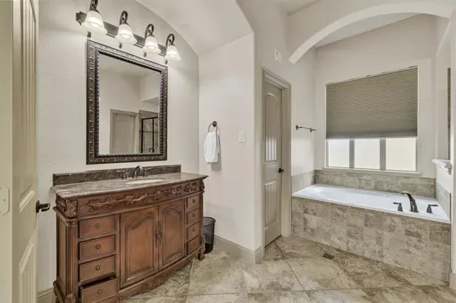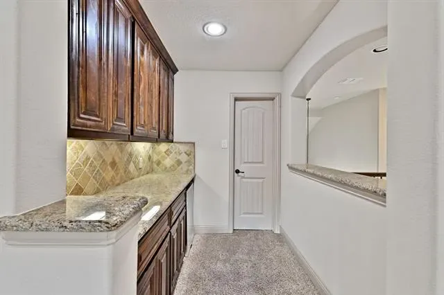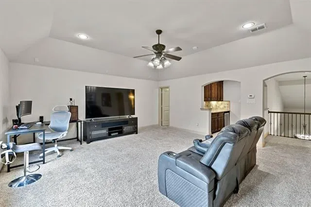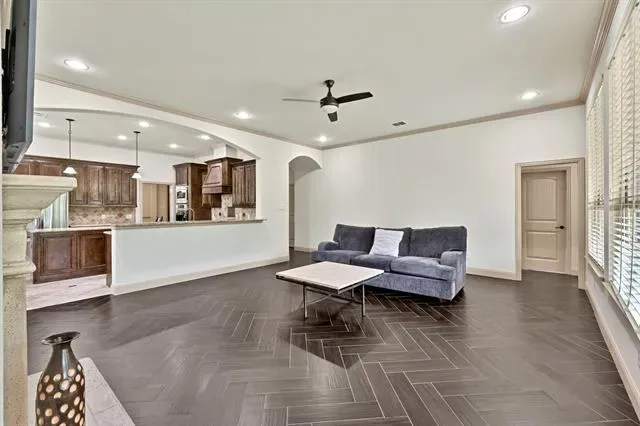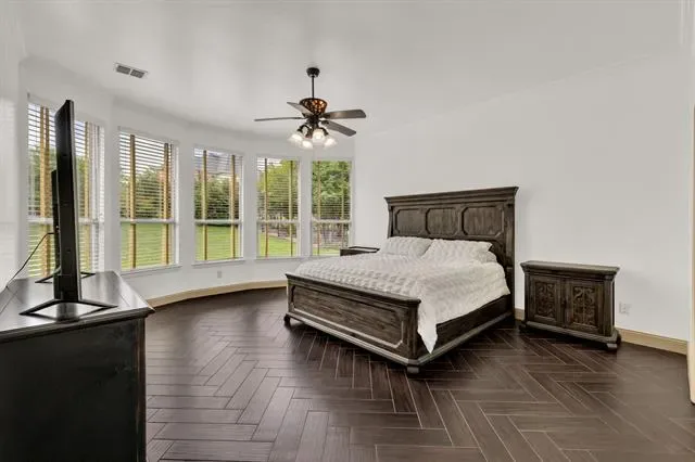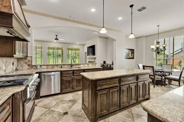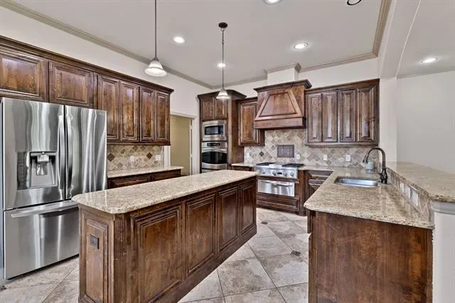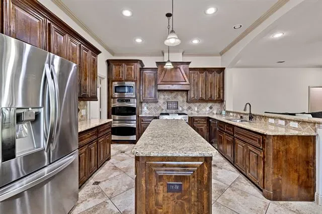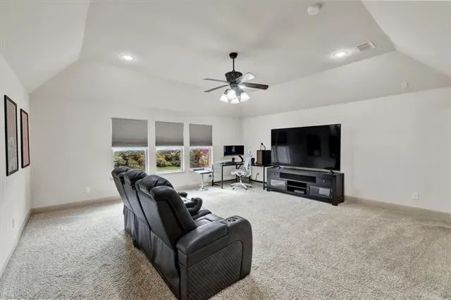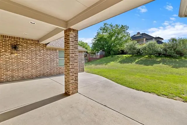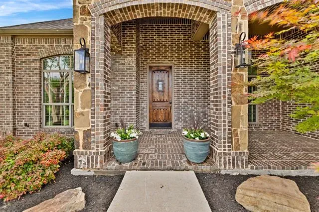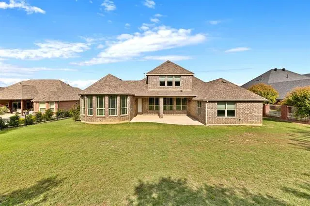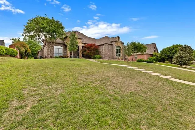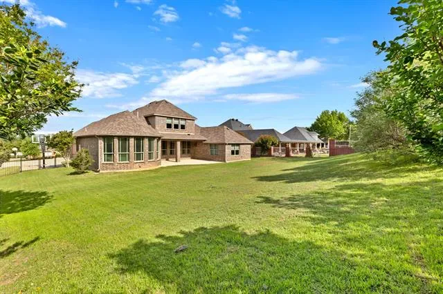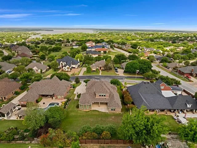 Elevated lot in sought-after Eagle Ridge, this custom two-story home offers stunning views, space, and flexibility on nearly half an acre. The main level features a private owner’s retreat with spa-like bath, dual granite vanities, jetted tub, walk-in shower, and oversized custom closet with built-ins. All secondary bedrooms are located downstairs, along with a formal dining room and a dedicated office with closet that could serve as a 5th bedroom. The gourmet kitchen includes a large island, granite countertops, double ovens, warming drawer, commercial-grade gas cooktop with grill, abundant cabinetry, and a walk-in pantry. Ceramic wood-look tile flows throughout the main level. Upstairs offers an expansive game-media room with full bath, bar, and generous storage—ideal as a second living area or guest quarters. Additional highlights include a 3-car garage with epoxy floors, pool-sized backyard, and covered front and back patios. Conveniently located near Eagle Mountain Lake.