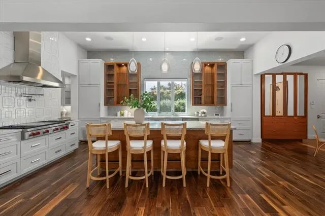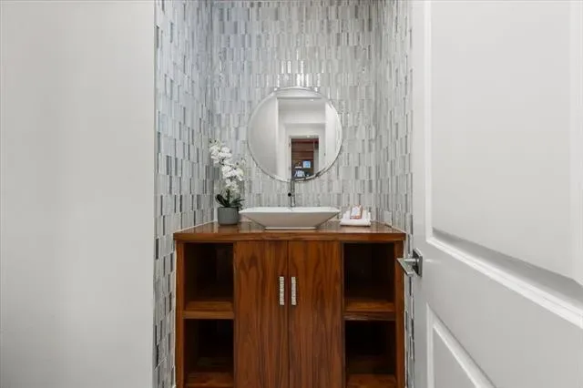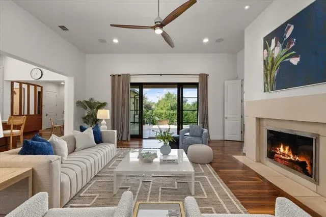 The backyard is tailored for year-round enjoyment. A covered patio and built-in grill extend the living space outside, overlooking a pool and spa framed by generous deck space. Whether hosting gatherings or enjoying quiet evenings at home, the setting accommodates both with ease.