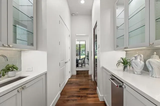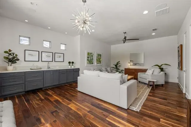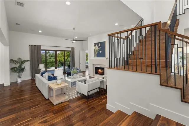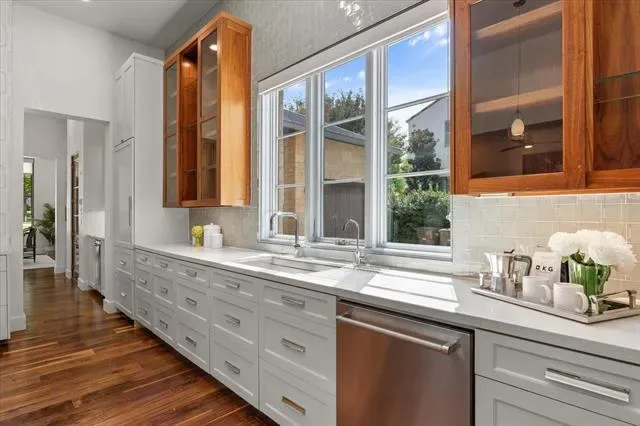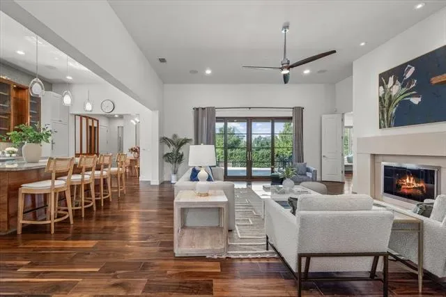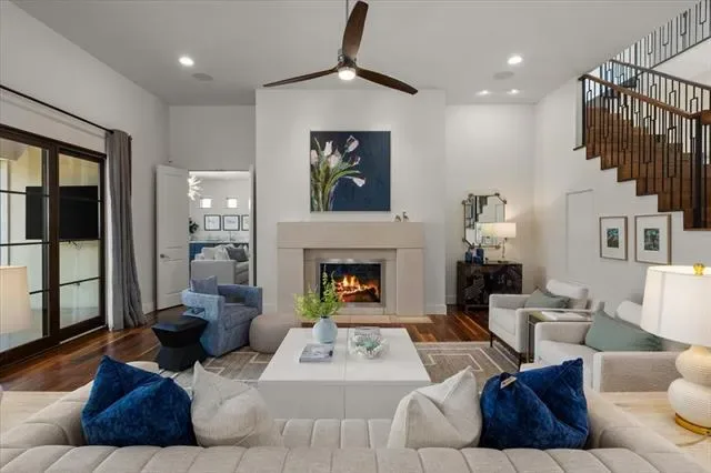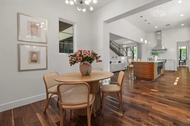 3824 Aviemore presents 5 bedrooms, 5.1 bathrooms, and a well-planned open layout designed for both function and style. Multiple living areas are enhanced by hardwood floors, tall ceilings, and custom finishes that give the home a polished yet inviting feel. The kitchen anchors the main level with Wolf appliances, steam and convection ovens, Sub-Zero refrigeration, wine storage, and walnut cabinetry topped with Brazilian Corteccia quartzite—an ideal balance of design and performance.