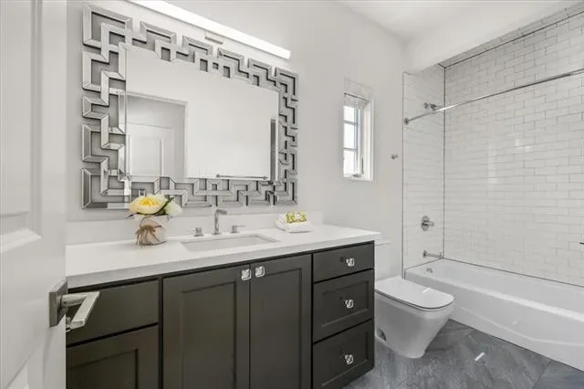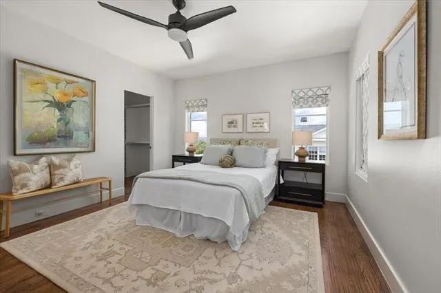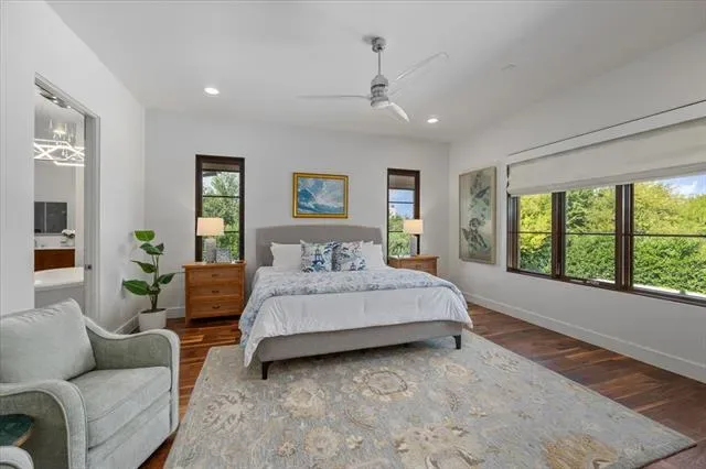 The primary suite is designed as a private retreat with dual custom closets, a spacious shower, and a soaking tub. Upstairs, additional bedrooms and living areas provide flexibility for family, guests, or home office use. Natural light fills the interior through expansive windows, creating a seamless connection to the outdoors.