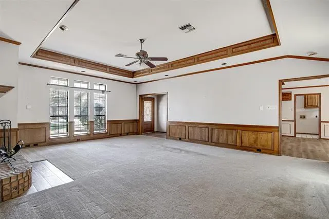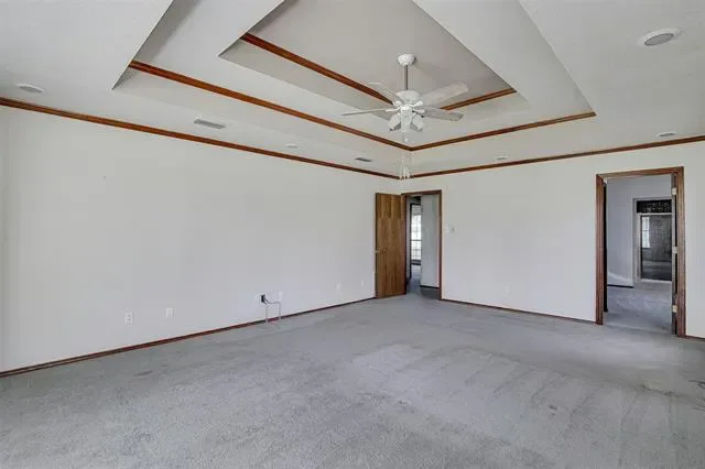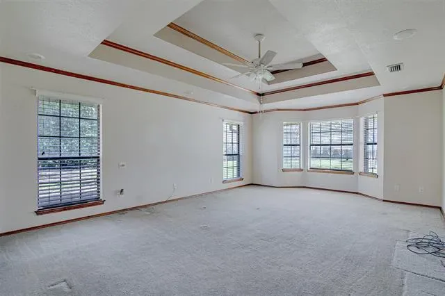 The primary suite features trayed ceilings and a cozy sitting area, along with an ensuite bathroom that includes a large dual-sink vanity, jetted tub, walk-in shower, and split closets.