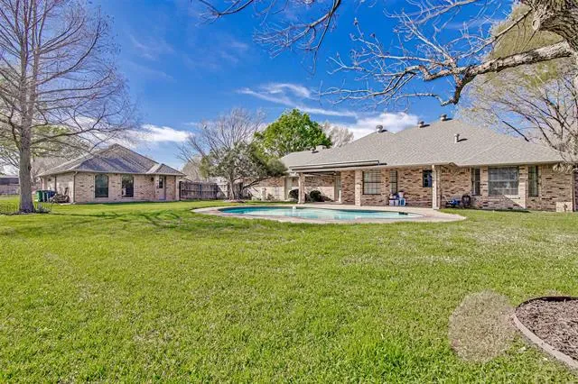 French doors within the living room lead to the covered back patio, creating a seamless connection to the backyard. The patio overlooks the stunning in-ground pool and oversized backyard, perfect for relaxing or entertaining. The property also includes a separate workshop with electricity and a one-car garage door, ideal for lawn equipment, pool supplies, storage, or hobby use.