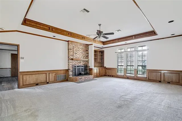 Upon entry, you’re welcomed by a spacious living area featuring a brick wood-burning fireplace, custom built-in cabinetry and shelving, and large windows that fill the room with natural light.