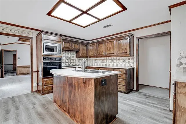 The kitchen is conveniently located just off the living area and features a large center island with breakfast bar seating, granite countertops, built-in oven and microwave, an electric cooktop, and a spacious dining area with windows overlooking the backyard.