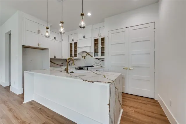 The chef-inspired kitchen is the heart of the home, showcasing a striking quartz waterfall island, custom cabinetry, and premium finishes, making it ideal for entertaining or everyday living.
