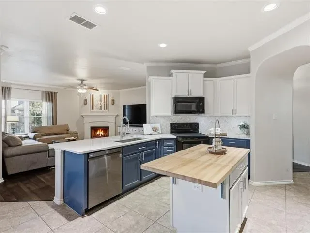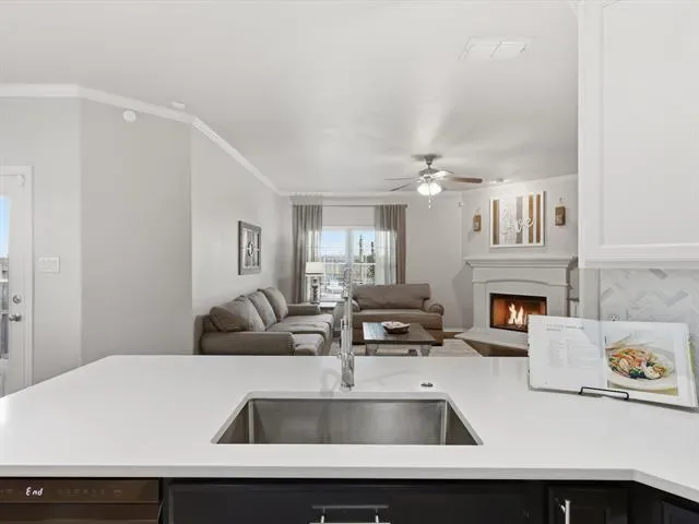 The open concept layout features a beautifully updated kitchen with gorgeous countertops, backsplash, and cabinetry, along with stainless steel appliances. The kitchen flows seamlessly into the living and dining areas, creating an ideal space for entertaining and everyday living. The main living area is warm and inviting with a cozy fireplace and abundant natural light.