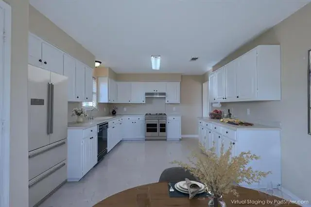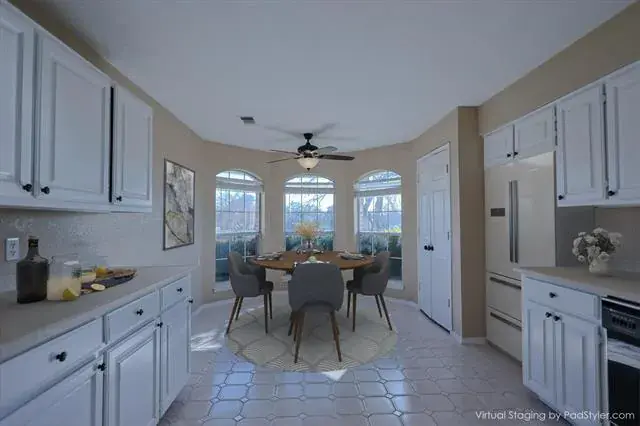 Inside, the home boasts a well-designed and comfortable layout, ideal for both entertaining and everyday living. Numerous recent updates include a new HVAC system (2024), new roof (2023), new water heater (2022). The living areas feature stylish wood-look ceramic tile flooring, while the bedrooms are finished with durable, EZ Care Luxury Vinyl Plank flooring. Tile flooring extends through the kitchen &' dining area, complemented by low-maintenance Corian countertops and abundant quality cabinetry.