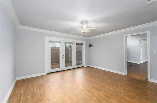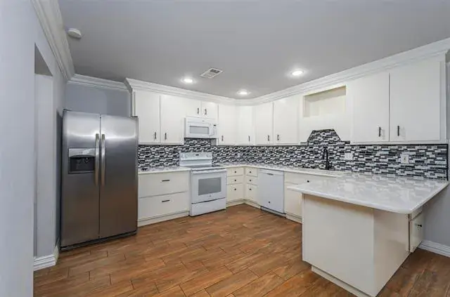 This move-in-ready, beautifully maintained and updated one-story townhome offers an open-concept layout designed for comfort and style. The renovated kitchen features new cabinetry, a stylish backsplash, marble countertops, a large pantry, and updated appliances. The home showcases new windows, wood-look tile flooring throughout with no carpet, elegant crown molding, and soaring vaulted ceilings that enhance the spacious feel. All bedrooms are generously sized and include private patios and large closets, while the primary suite offers an updated bath and an oversized walk-in closet. The attic has been insulated and includes a radiant barrier for added efficiency.