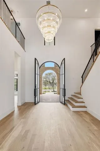 Step through the massive double glass front door and into a grand foyer with a sweeping staircase. Just ahead is the dramatic family room that overlooks the massive, covered patio. Two fireplaces provide warmth and ambiance to both the family and the covered patio. The wall of windows and large sliders from the family room, showcase the custom swimming pool and expansive outdoor living spaces. From here, enjoy panoramic bluff and lake views that stretch endlessly beyond the custom-designed swimming pool.