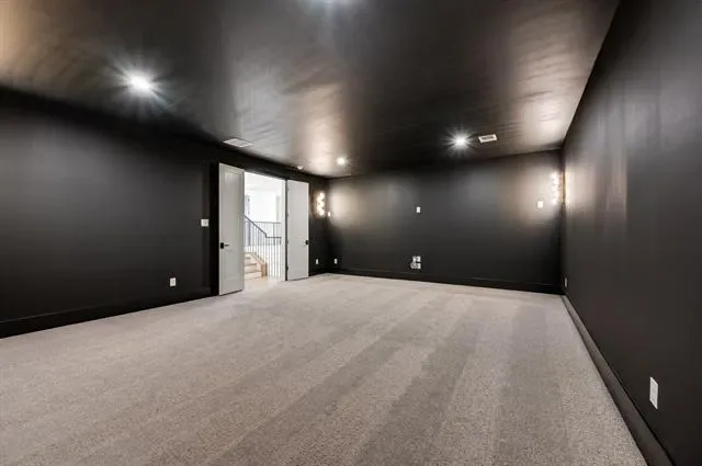 The owner’s wing occupies the entire right side of the home, providing a serene retreat. The primary suite features a spa-inspired bathroom with dual vanities, a freestanding soaking tub, and a massive walk-in shower with dual shower heads. The spacious custom walk-in closet offer luxury and organization. Also on the main level are a private guest suite with full bath and walk-in closet, and an executive study with refined finishes.
