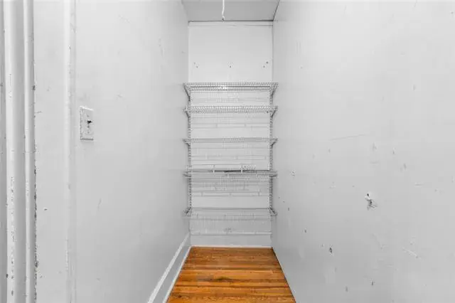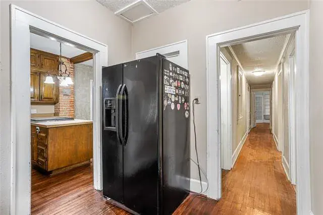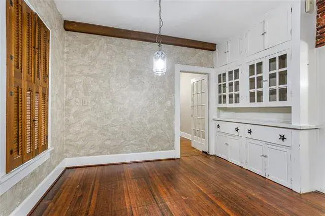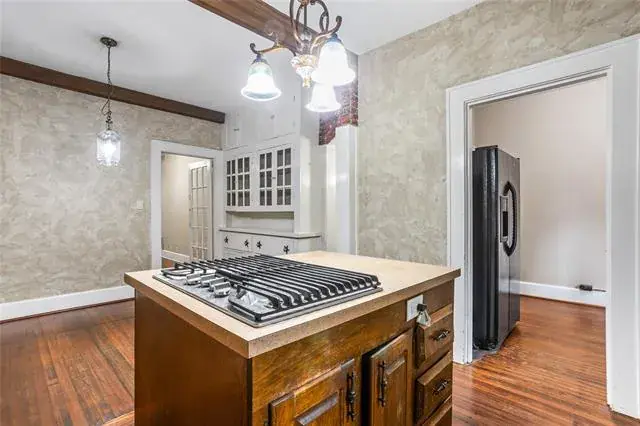 Inside, you’ll find original wood floors, large windows flooding each room with natural light, and a cozy living area with a classic brick fireplace. The kitchen showcases abundant wood cabinetry, a gas cooktop island, and built-in storage that adds to the home’s vintage charm.
