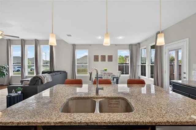 The kitchen is anchored by a generous island with seating, granite countertops, a tile backsplash, stainless steel appliances, a gas cooktop, a wall oven &' a built-in microwave, plus a large pantry &' extensive cabinetry for streamlined storage. Recessed lighting &' statement pendants highlight the clean lines, while the connected dining &' living spaces create a polished backdrop for everything from quiet evenings to full gatherings. A main-level laundry room &' thoughtful storage throughout keep the home feeling calm &' uncluttered.