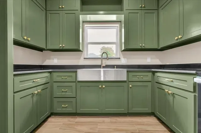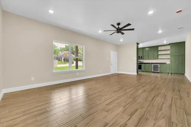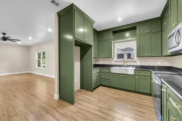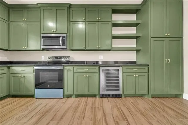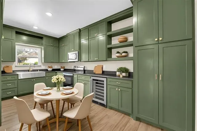 From the moment you step inside, you’ll notice the thoughtful design and elevated finishes throughout. The kitchen is truly the centerpiece, featuring olive green cabinetry, sleek hardware, and a clean, modern aesthetic that feels both bold and timeless. Complete with a stove, microwave, and wine cooler, this space was designed for both function and style.