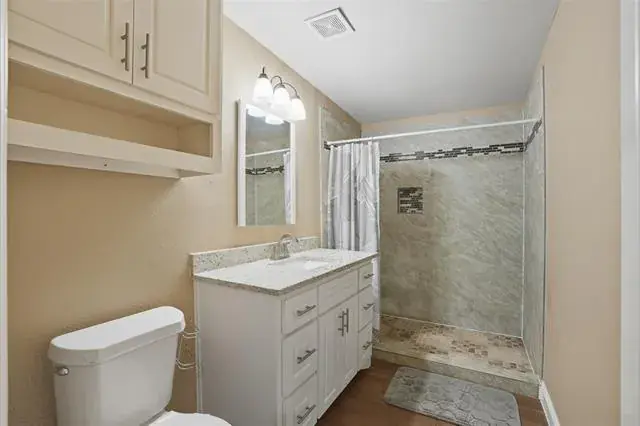 Inside, you’ll find gleaming wood floors, elegant granite countertops, and stylish tile finishes in both bathrooms. The primary suite features a beautifully tiled walk-in shower, while the secondary bath offers a classic tub-shower combination. The open layout allows natural light to flow effortlessly, enhancing the home’s warm and inviting atmosphere.