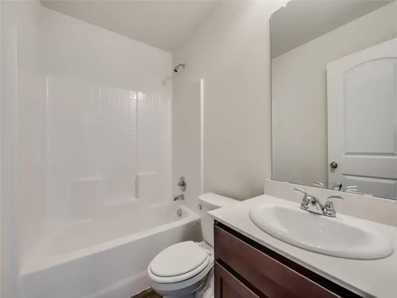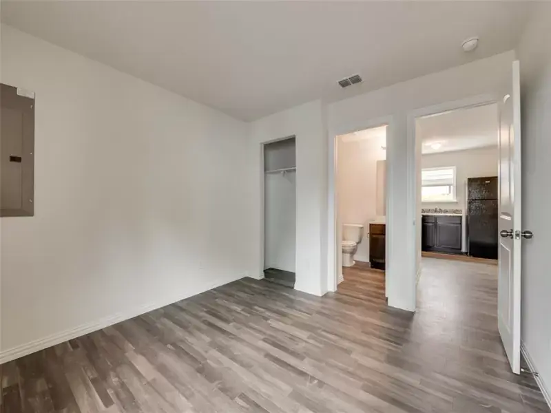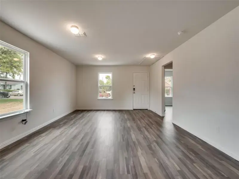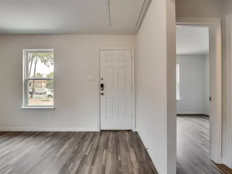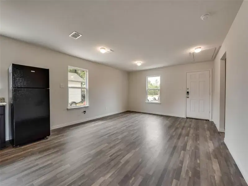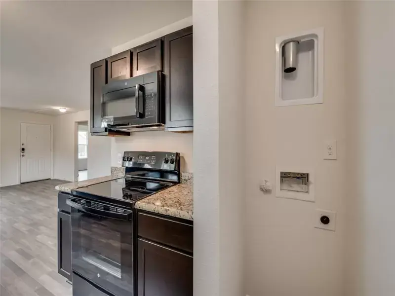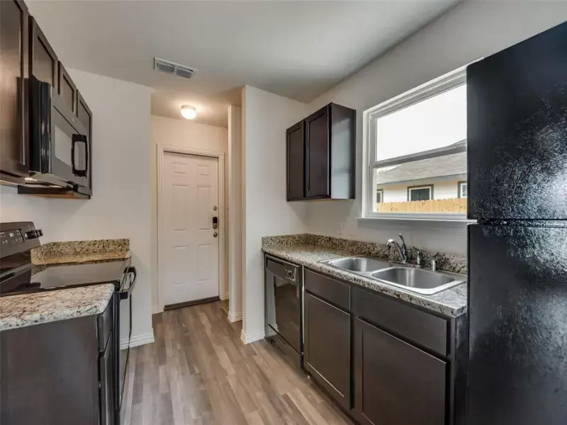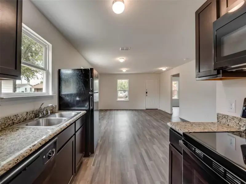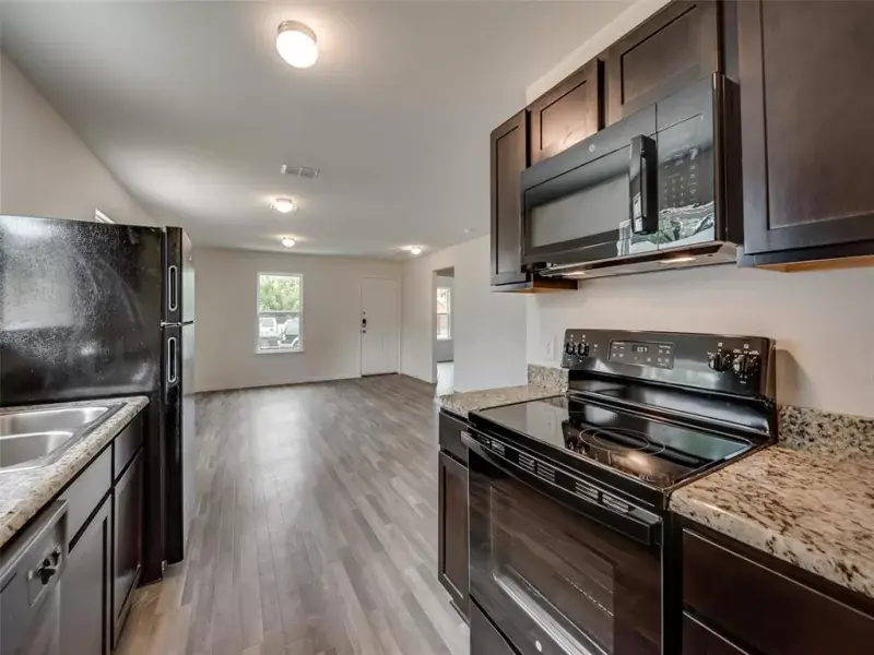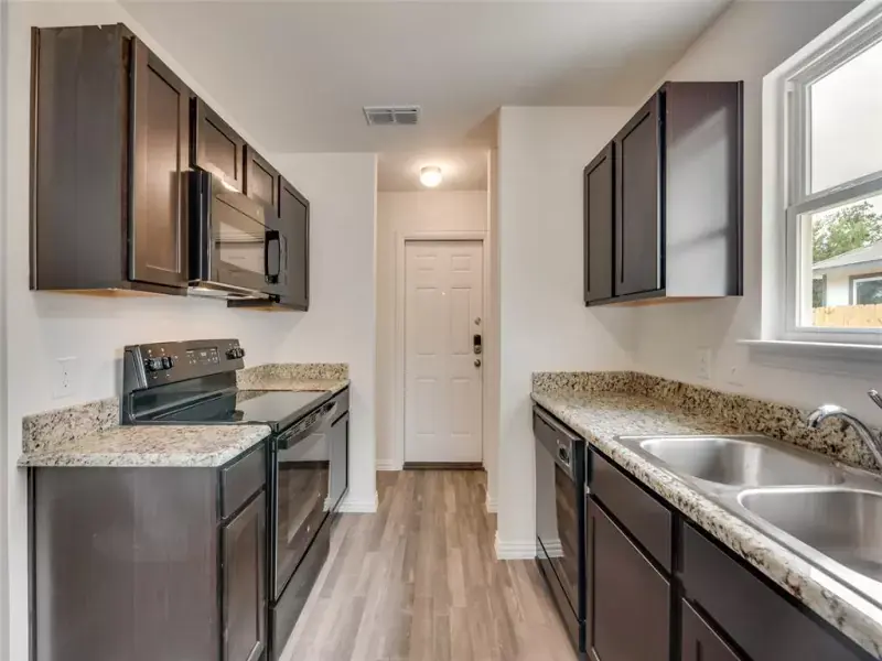 3 bedrooms; 2 bathrooms; two motion exterior floodlights; low E insulated glass windows with screens; weather stripping on all exterior doors; smooth two square 6ft interior doors; 3.25 in baseboard moulding; 30in flat panel kitchen cabinets; vinyl flooring; 50-gallon electric water heater; programmable smart thermostat; keyless smart locks; granite countertops; microwave; electric range; energy-efficient dishwasher; refrigerator; 50-50 stainless steel kitchen sink.
