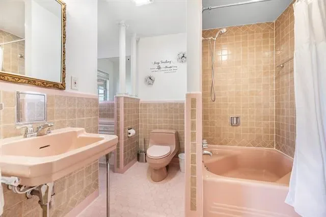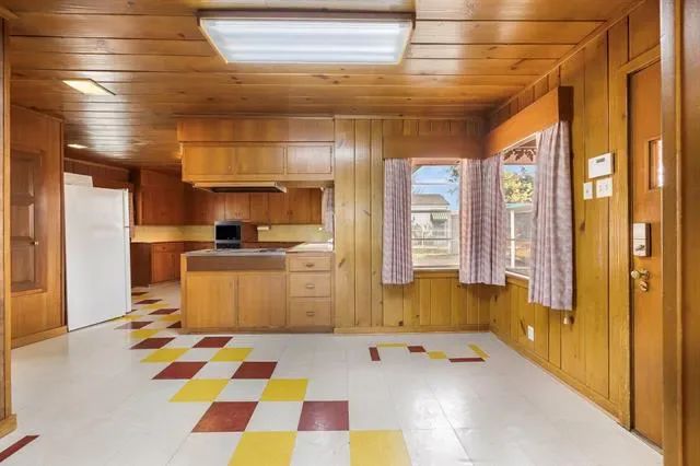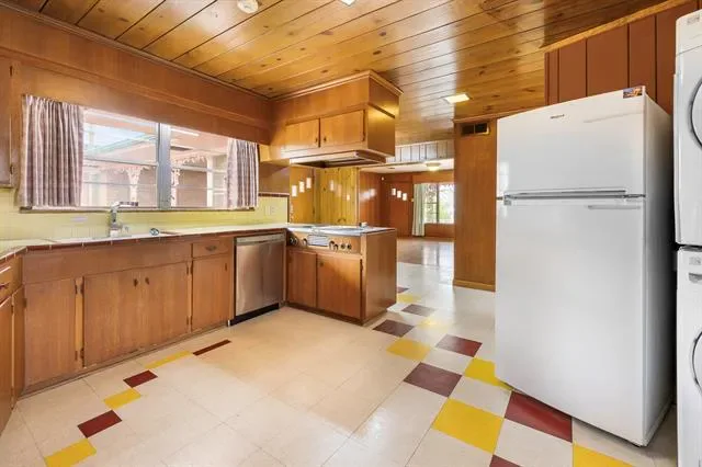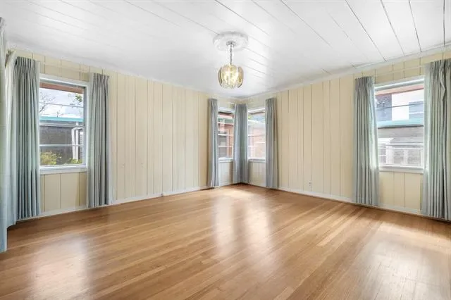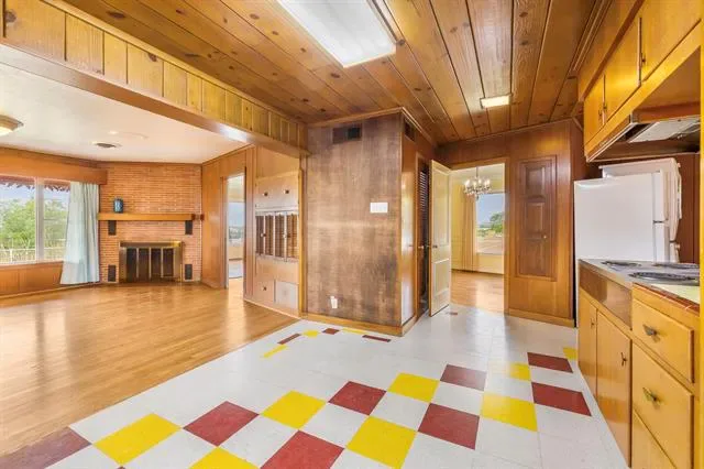 Inside, you’ll find refinished original wood floors, crown molding, chandeliers, oversized windows, and two wood-burning fireplaces that showcase the home’s authentic character. The spacious layout offers abundant storage and natural light throughout. The vintage kitchen maintains its original charm with ample cabinetry and workspace, while the living areas provide flexibility for modern living.
