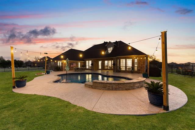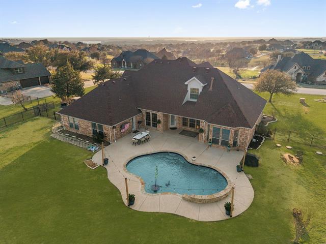 A location that can’t be beat! Situated on 1.49 acres outside city limits in the highly sought-after gated community of Harbour View, this home is less than one mile from Harbour One Marina at Eagle Mountain Lake. Store your boat nearby and enjoy true lake living, all while being zoned for the brand-new Eagle Mountain High School in one of the area’s top school districts. Designed for entertaining, the open floor plan is filled with natural light and offers seamless flow between living spaces. The spacious family room opens to a private backyard retreat featuring a gunite swimming pool and expansive green space. A dedicated garden area provides the perfect foundation for raised beds, landscaping, or outdoor entertaining tailored to your vision. The home office features built-in desk and shelving with coffered ceilings. The kitchen includes granite countertops, gas stove, generous prep space, and open to the main living areas. Three oversized secondary bedrooms are split from the private primary suite, which includes dual sinks and a walk-in shower. Upstairs offers exceptional flexibility with a media room, a private 5th bedroom ideal for guests or teens, and a second living area that can function as a game room, gym, or play space. Community amenities include a security gate, rolling hills, walking trails, park with jungle gym and fishing ponds.