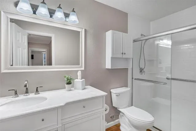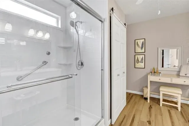 The main floor showcases durable wood look LVP flooring, creating warmth and continuity throughout the living spaces. The spacious primary suite offers a spa-like retreat with an oversized walk-in shower in the primary bath.
